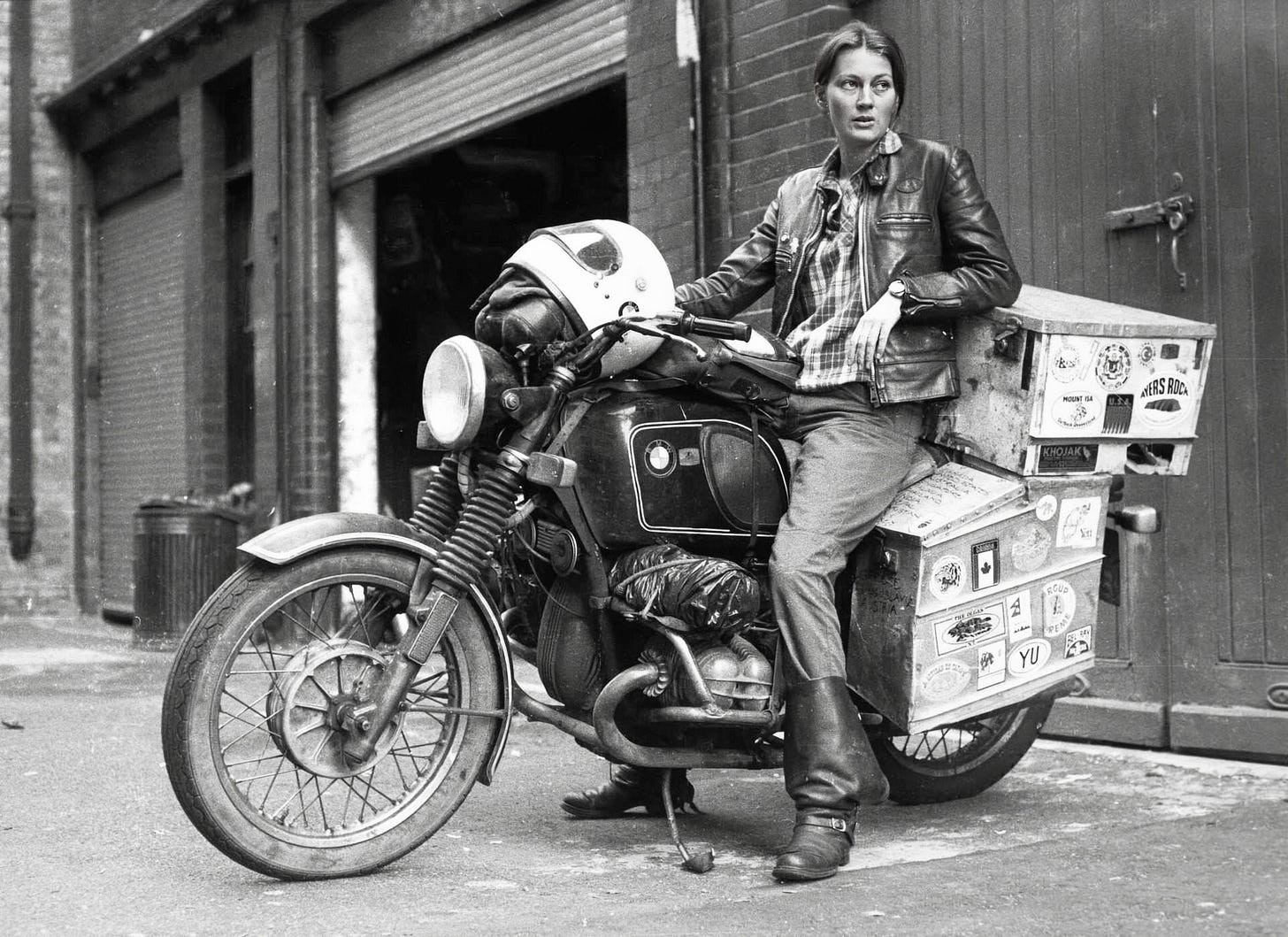 She was an avid motorcyclist, having taken several long tours around Europe. So, in 1982 she shipped her BMW R60/6 from her home in London to New York and headed west across the United States, on to New Zealand, Australia, and across Asia to Europe and then finally home in England.